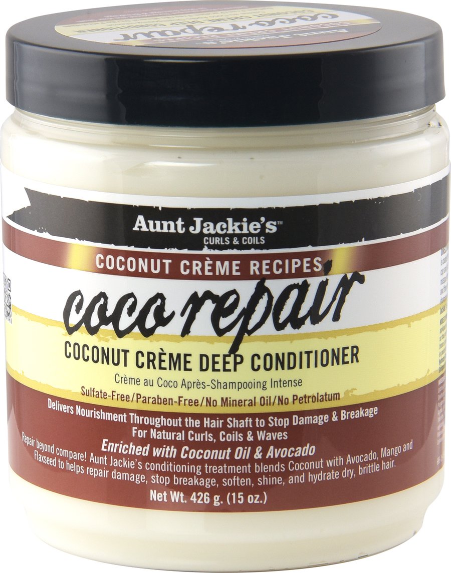 Infused with carrier oils that pull nutrients into the hair shaft, Aunt Jackie’s Coco Repair recipe helps to improve the look and feel of chronically dry, fragile tresses. Whether damage is from chronic dryness, over-processing with chemical straighteners or color, heat styling, braiding, or certain environmental conditions, Coco Repair is an effective remedy to help return hair to a vibrant, softer state. Especially good for 2c-4c textures.