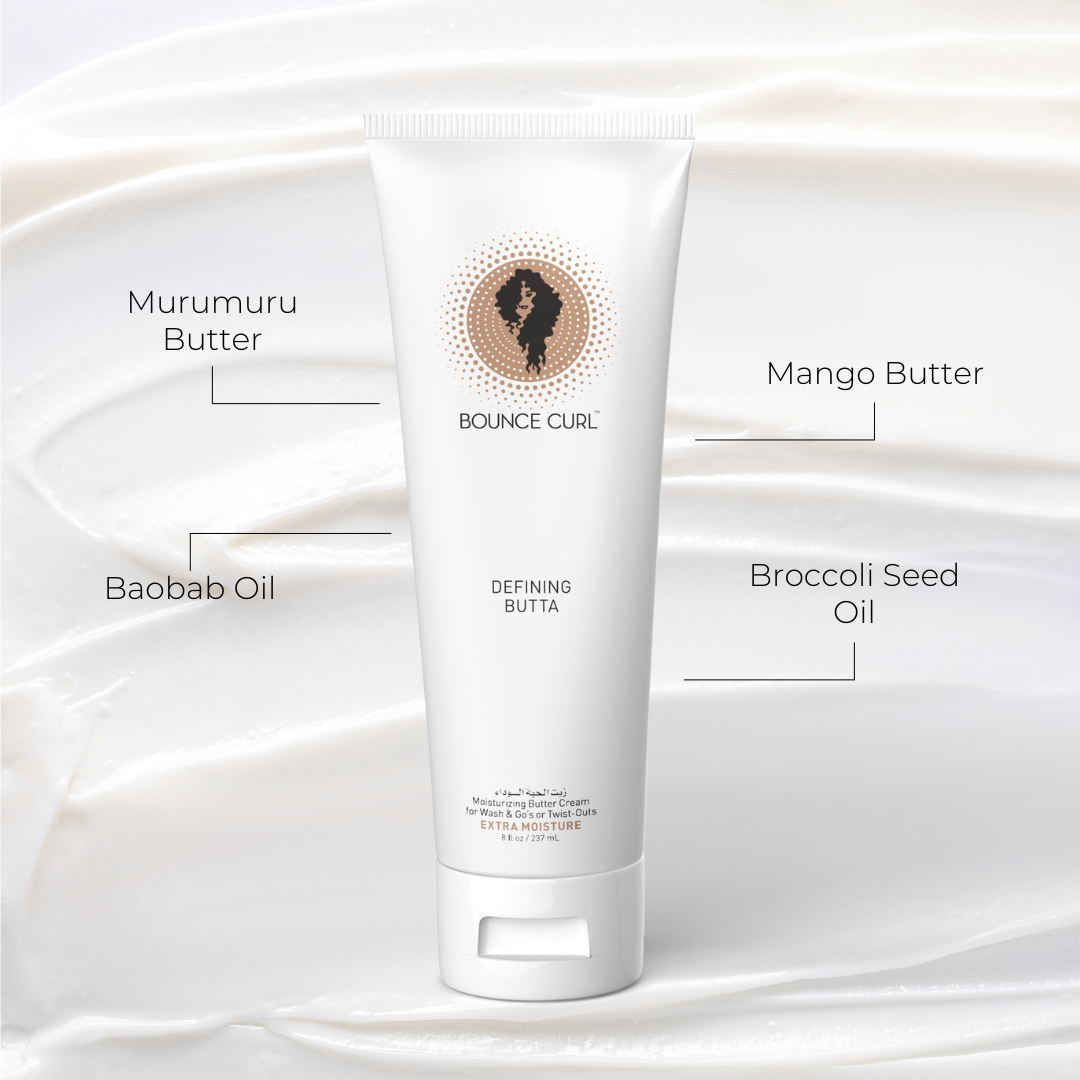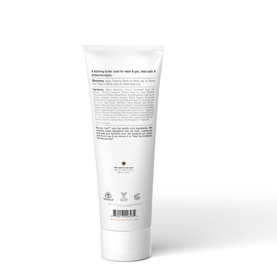 Bounce Curl Defining Butta, tailored for Kinky-Coily Type 4a-4c or exceptionally thick hair. This versatile cream is perfect for twist-outs, wash & gos, and protective styles. It moisturizes and provides a light to medium hold, all in one product. Infused with premium oils and butters like murumuru butter, baobab oil, and mango butter, it nourishes and hydrates your hair. Experience the transformative power of our Defining Butta, elevating your natural hair and styling options.
